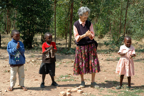 Tout comme l'ETP, cette école est paroissiale, ne l'oublions pas. Par la suite, nous nous rendons à l'extérieur où les enfants entament une ronde avant de se lancer dans d'autres jeux. Trop longtemps assis sagement à l'intérieur de la classe, les enfants en profitent maintenant pour se divertir et se défouler de plus bel... Mama Carla est même de la partie! Mama Carla clôture la visite par une distribution de bonbons... |