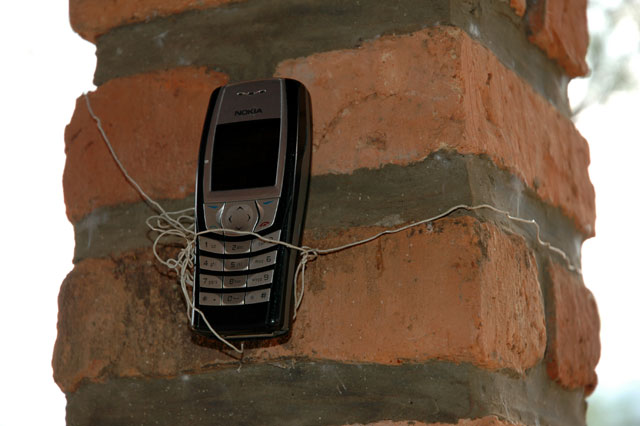 Quant à nous, nous parvenons à capter depuis notre maison une "barre" du réseau de téléphonie mobile. Pour ce faire, notre téléphone doit être maintenu contre l'une des colonnes de la terrasse (qui probablement tient le rôle d'antenne). Les précédents volontaires ont bricolé à cet effet un dispositif permettant de fixer le téléphone, ce qui nous permet de recevoir et envoyer des sms.