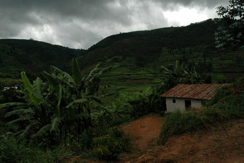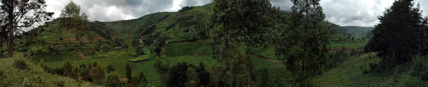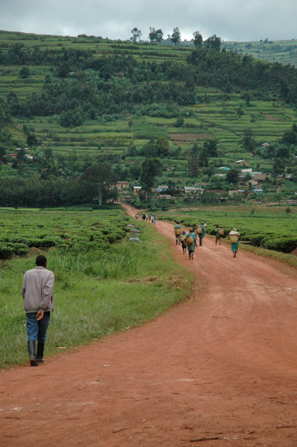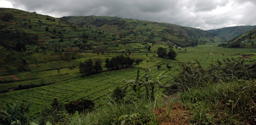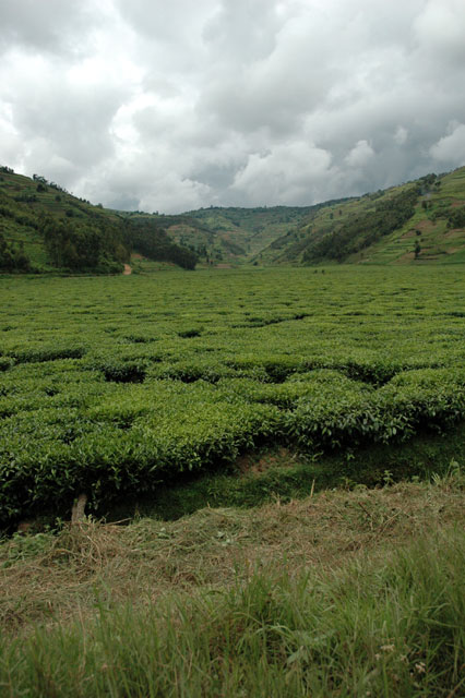 En nous rendant en taxi-bus à Byumba afin d'encourager les équipes finalistes de basket-ball et de handball de l'ETP, nous empruntons la route (ou plutôt la piste de terre) traversant les plantations de thé vert de la région. Les manifestations bruyantes de notre enthousiasme (il faut compter trois Suisses et 13 élèves qui s'extasient...) à la vue de ses étendues de théiers verdoyants, pousse le chauffeur à faire une courte halte afin de nous laisser admirer les plantations de la vallée. |