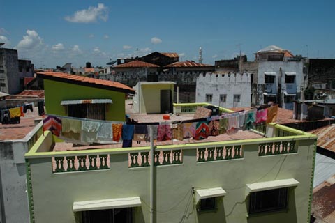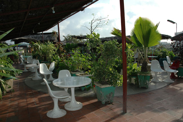 Après huit heures de bus, nous arrivons à Mombasa. Nous choisissons de loger pour quelques jours à l'hôtel "Splendid". La terrasse bâtie sur le toit de l'hôtel offre un large panorama des quartiers environnants. Bien qu'agréable, le foisonnement de plantes et de parasols ne parvient pas à nous faire oublier la moiteur tropicale. Nous nous réjouissons de bientôt nous baigner dans l'océan, mais ce n'est pas pour tout de suite: il n'y a pas de plages à Mombasa... |