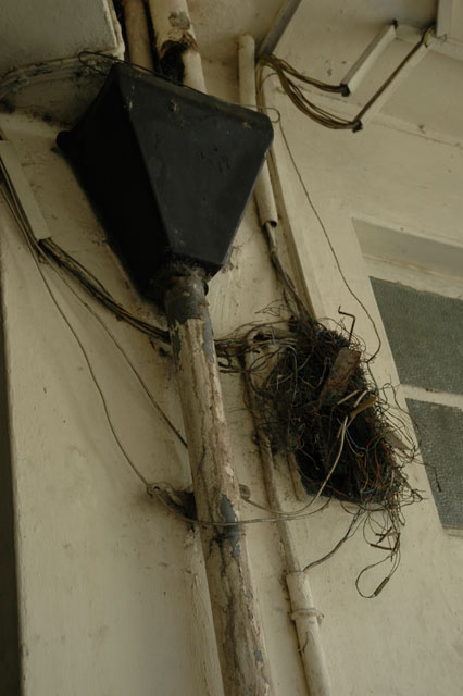 Les chambres de l'hôtel "Splendid", bien qu'anciennes, sont bien tenues. Malheureusement, ce n'est pas le cas de l'installation téléphonique et électrique. Malgré l'amas chaotique de câbles (cf. photo), le téléphone fonctionne très bien (nous l'avons testé). Bien que complexe, cette "technique" de câblage est adoptée dans toute l'Afrique de l'Est!